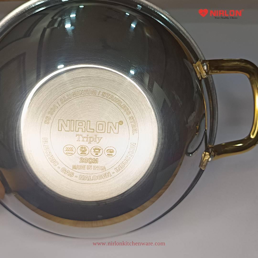 The NIRLON Karat Triply Stainless Steel Cookware Deep Kadhai is a premium addition to modern kitchens, engineered for superior performance, elegance, and long-term durability. Designed by experienced stainless steel kadai manufacturers, Nirlon, this kadai combines advanced triply technology with luxurious aesthetics to meet the expectations of both home cooks and professional kitchens. As a trusted stainless steel utensils manufacturer, Nirlon Kitchenware focuses on creating cookware that supports healthier cooking while delivering consistent results.