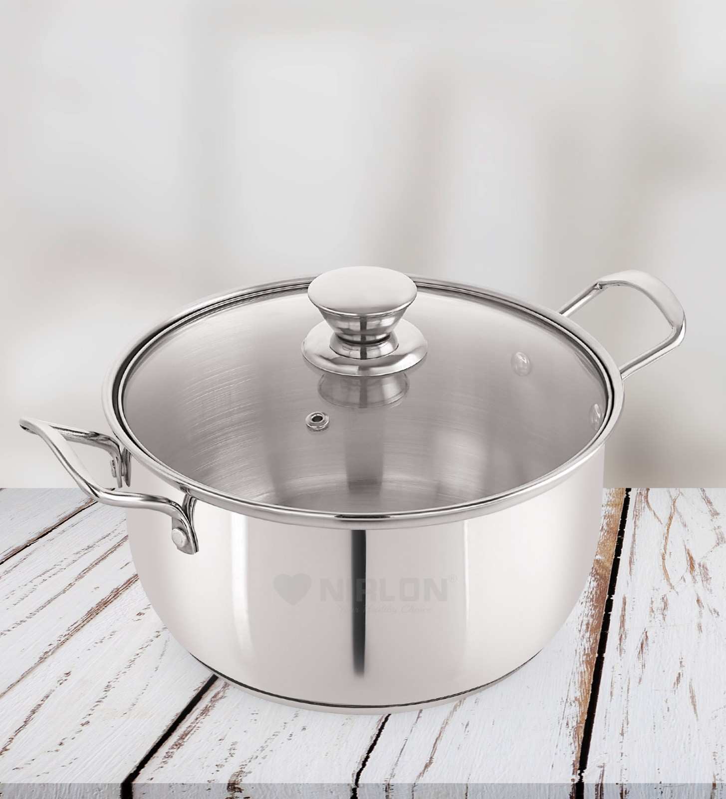 NIRLON casserole Multi-purpose cook n serve set, a perfect gifting option Energy-efficient and induction compatible sandwich base professionally manufactured using heavy gauge Stainless steel Riveted long-lasting stay cool handles, and tempered glass lids with steam release. It is a multi reason cooking set. Simple to clean and hygenic tempered steel, Tri employ enlistment base. Expertly produced utilizing and weighty measure tempered steel an ideal giving arrangement. Energy proficient tri handle acceptance viable sandwich base for quicker cooking.