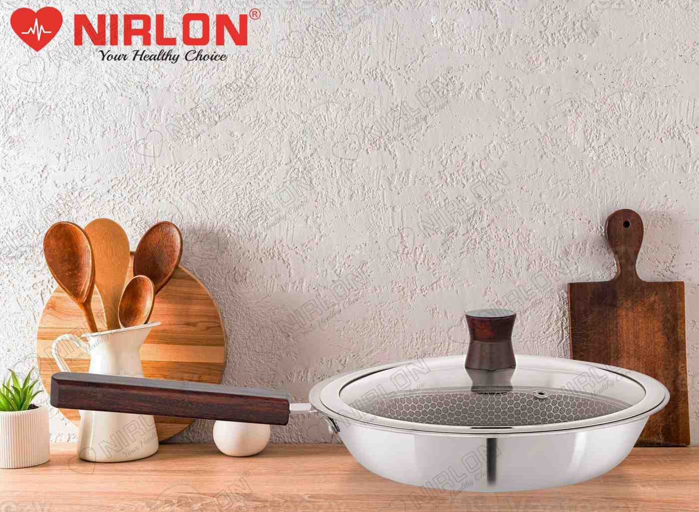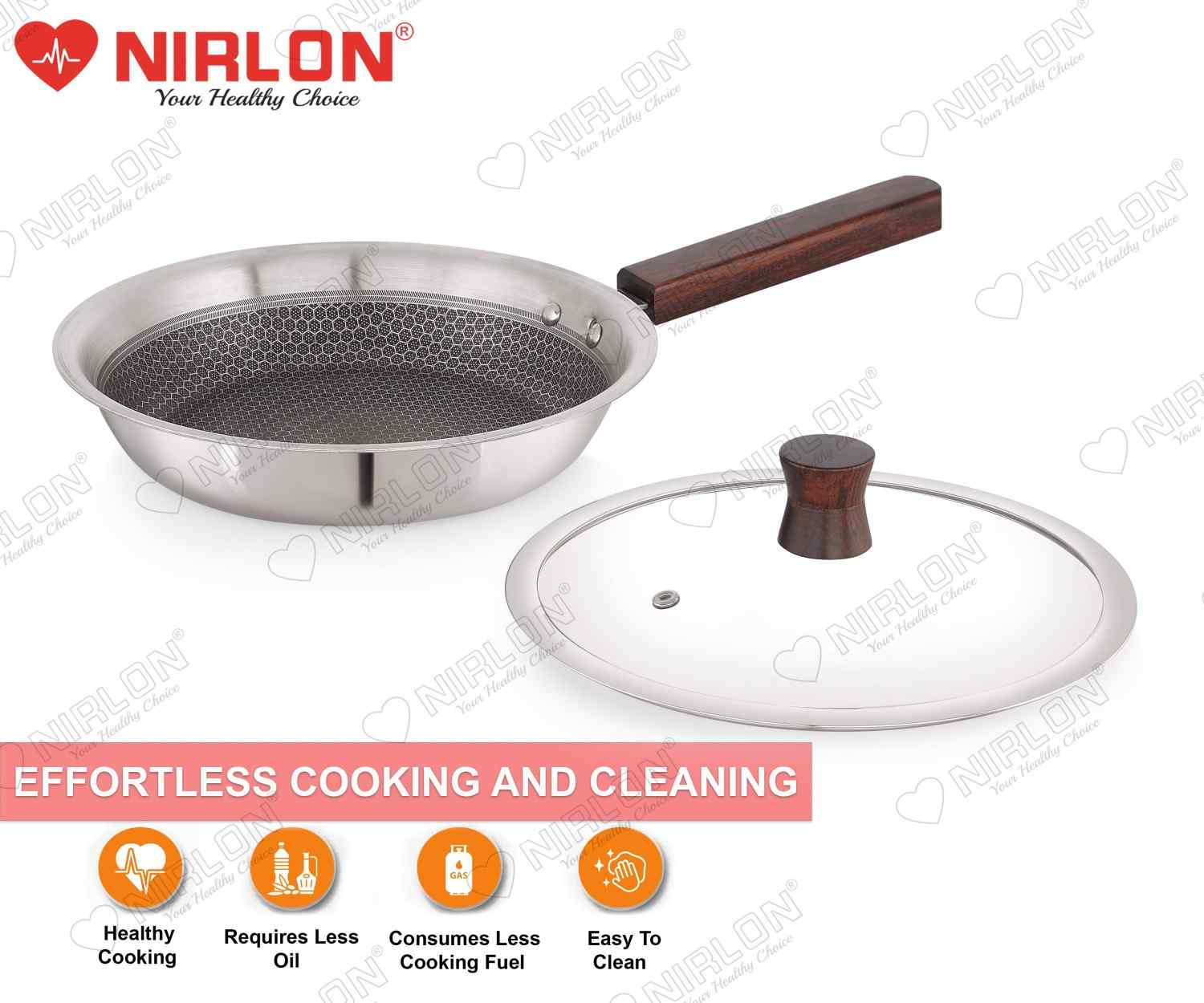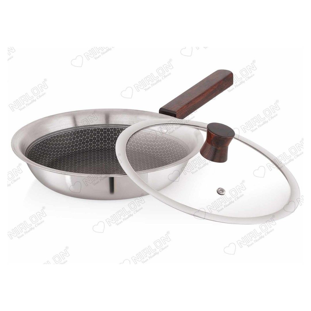 NIRLON newest Honeycomb Woody Series is Triply construction stainless steel cookware designed for your daily cooking requirements, for preparing healthy, flavorful meals for your family and friends. The cookware is built by carefully infusing the highest-grade metals, together for a seamless one-piece shiny cookware. Inner SS 304 stainless steel resists acidic foods and solutions to provide great tasting meals and avoid discolouration in food. Also, the non-reactive 18/10 surface resists heavy metal atoms from mixing in your food. The aluminium core provides uniform heat distribution throughout the cooking surface and retains heat within itself to help you burn 50% less gas/electric power per square millimetre of the cooking surface. The outermost 18/0 layer of magnetic steel provides a robust cover to inner surfaces while resisting rust and evenly conducting heat around the cookware body. The Honeycomb Woody Range of cookware is designed robustly to ensure cooking seems less like a chore. The cookware can provide you and your family with a long-lasting, easy-to-handle, chemical-free healthy cooking alternative to all the other usual cookwares available online.