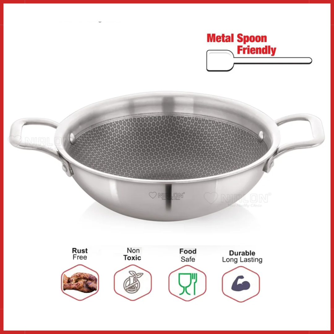 NIRLON newest Prima Series is Triply construction stainless steel cookware designed for your daily cooking requirements, for preparing healthy, flavorful meals for your family and friends. The cookware is built by carefully infusing the highest-grade metals, together for a seamless one-piece shiny cookware. Inner SS 304 stainless steel resists acidic foods and solutions to provide great tasting meals and avoid discolouration in food. Also, the non-reactive 18/10 surface resists heavy metal atoms from mixing in your food. The aluminium core provides uniform heat distribution throughout the cooking surface and retains heat within itself to help you burn 50% less gas/electric power per square millimetre of the cooking surface. The outermost 18/0 layer of magnetic steel provides a robust cover to inner surfaces while resisting rust and evenly conducting heat around the cookware body.