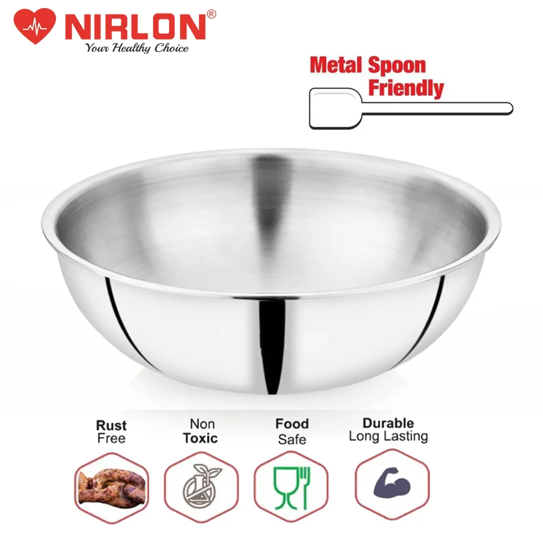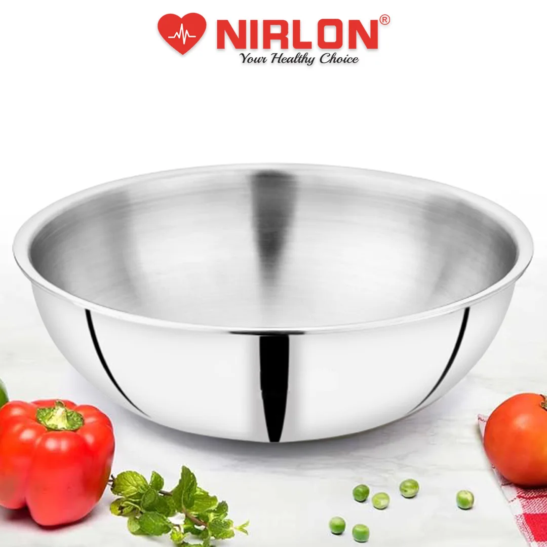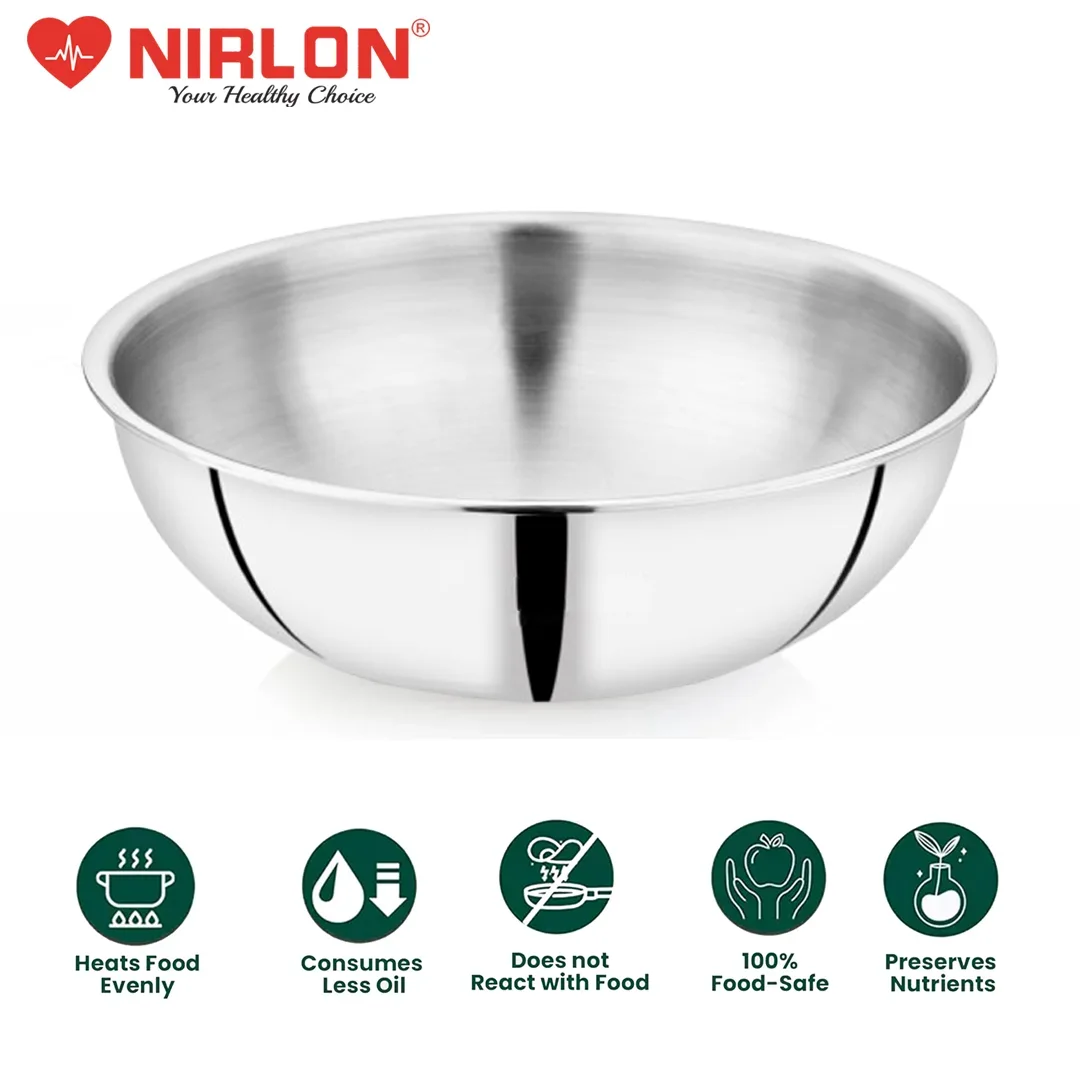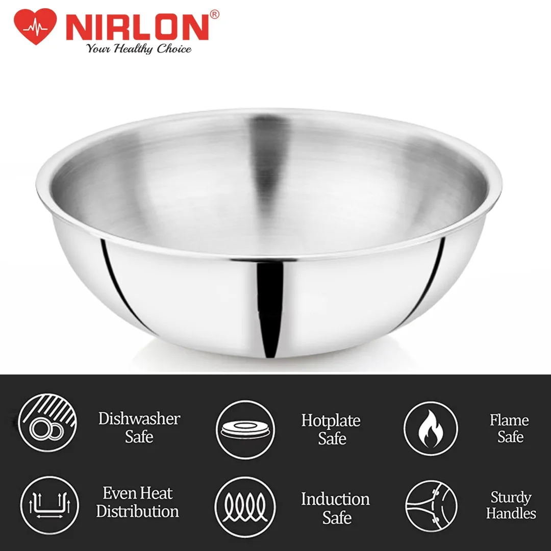 NIRLON newest Smart Series is Triply construction stainless steel cookware designed for your daily cooking requirements, for preparing healthy, flavorful meals for your family and friends. The cookware is built by carefully infusing the highest-grade metals, together for a seamless one-piece shiny cookware. Inner SS 304 stainless steel resists acidic foods and solutions to provide great tasting meals and avoid discolouration in food. Also, the non-reactive 18/10 surface resists heavy metal atoms from mixing in your food. The aluminium core provides uniform heat distribution throughout the cooking surface and retains heat within itself to help you burn 50% less gas/electric power per square millimetre of the cooking surface. The outermost 18/0 layer of magnetic steel provides a robust cover to inner surfaces while resisting rust and evenly conducting heat around the cookware body.